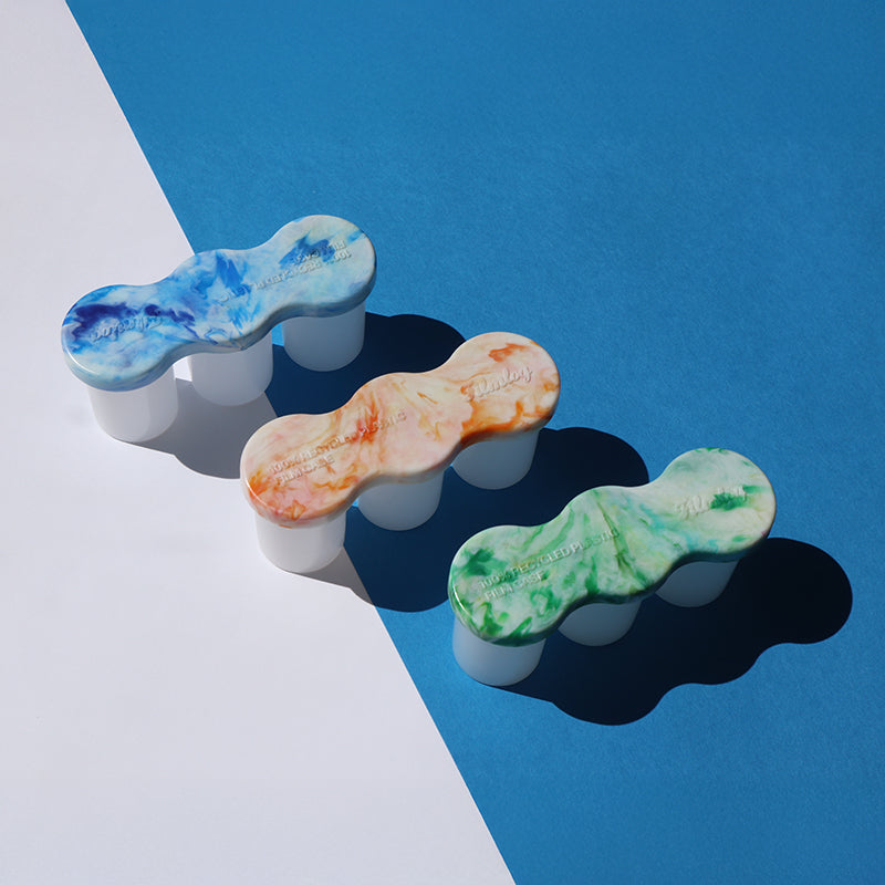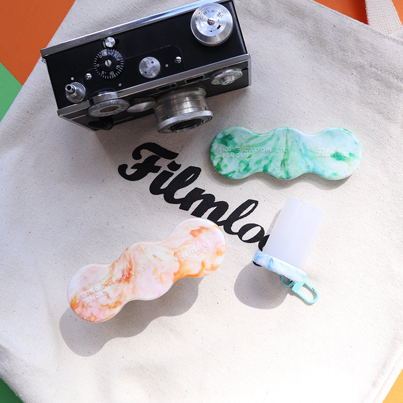 A reusable film case made from 100% recycled plastic and recycled plastic film canisters, by friends at FilmLog, designed to store and protect 3 rolls of 35mm film. Each case features a unique plastic marbled lid pattern.