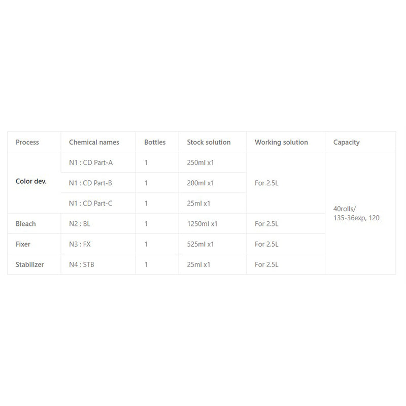 Each component of the processing chemical comes in a concentrated solution, allowing you to effortlessly create a maximum of 2.5L working solution. With this capacity, you can efficiently process up to 40 rolls of film, whether they are 135-36exp or 120 films.