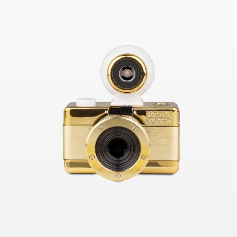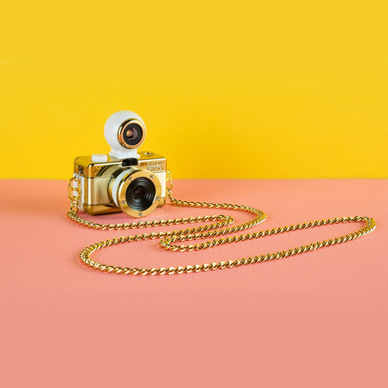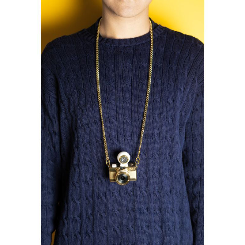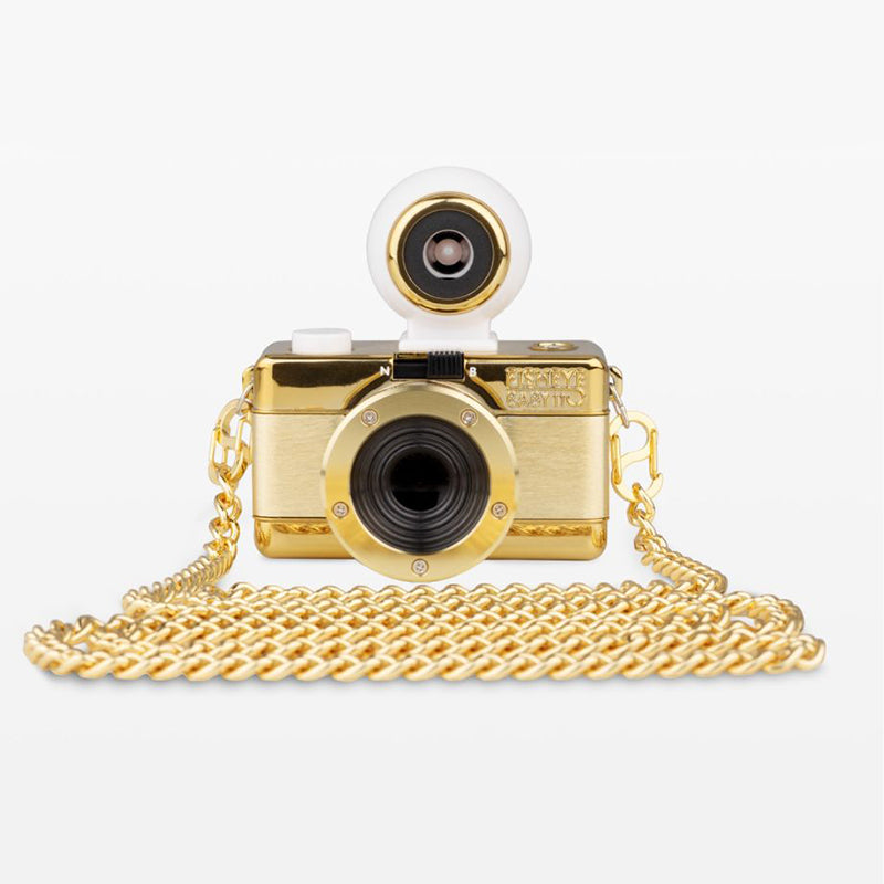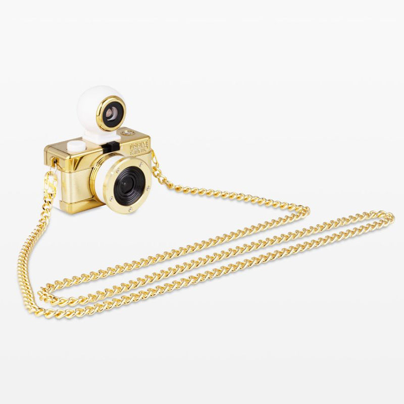 Dressed in a gleaming gold finish and complete with a long gold neck chain, the oh-so-adorable Fisheye Baby 110 Camera may be small, but it packs a 170-degree punch, shooting super-cool bulbous spheres on 110 film.