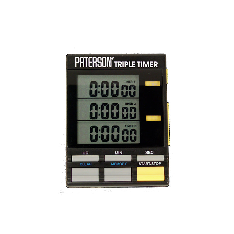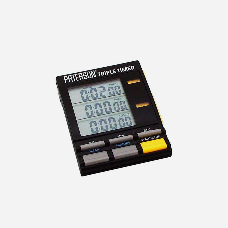 A battery operated timer that can be used as a clock, stop-watch or a three stage timer. The three coundown stages can be run simultaneously or as separately switched timers each counting up again after reaching zero.