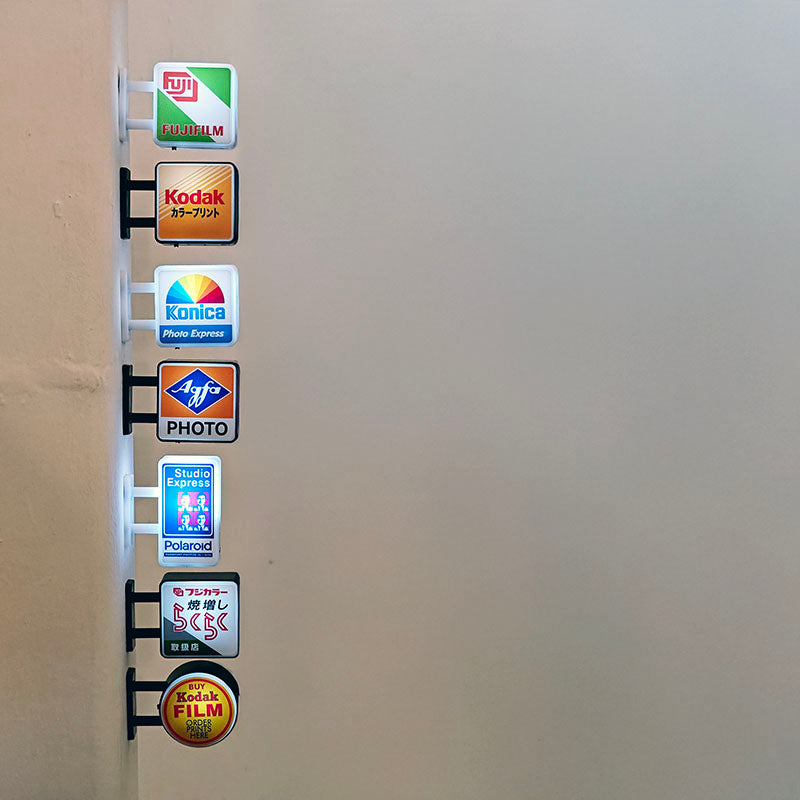 Bring back the golden age of analog photography with this unique set of miniature illuminated-style signage magnets. Featuring iconic photo brands, Fujifilm, Kodak, Konica, Agfa, Polaroid, and more. Each magnet recreates the nostalgic storefront signs once seen outside neighborhood photo labs.